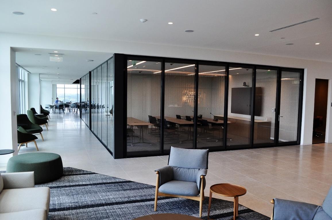 A Unified Look: Modernfold’s Acousti-Clear portfolio incorporated both operable glass walls as well as demountable glass walls with one unified look. Visually, the consistent extrusions and rail components across the product family provided a seamless visual experience throughout the space. This gave the architect peace of mind from a design standpoint.